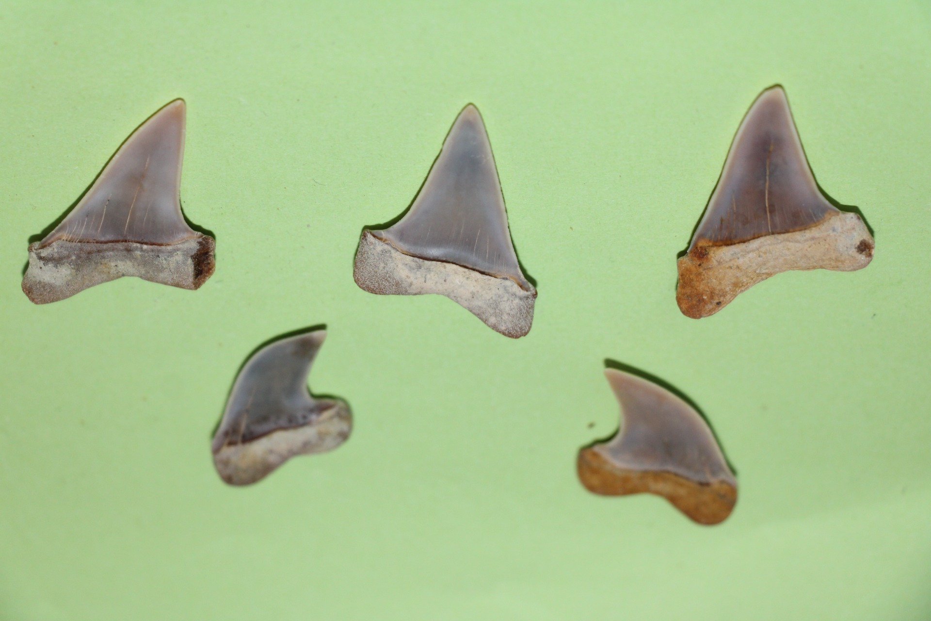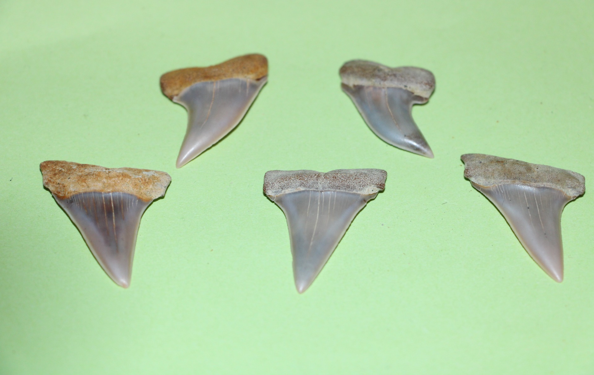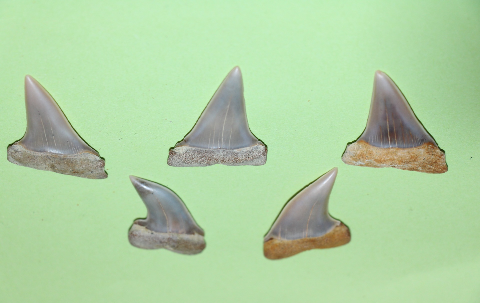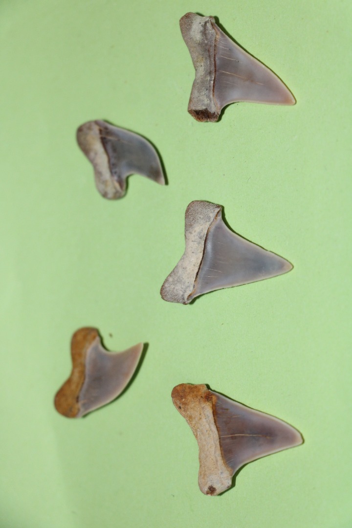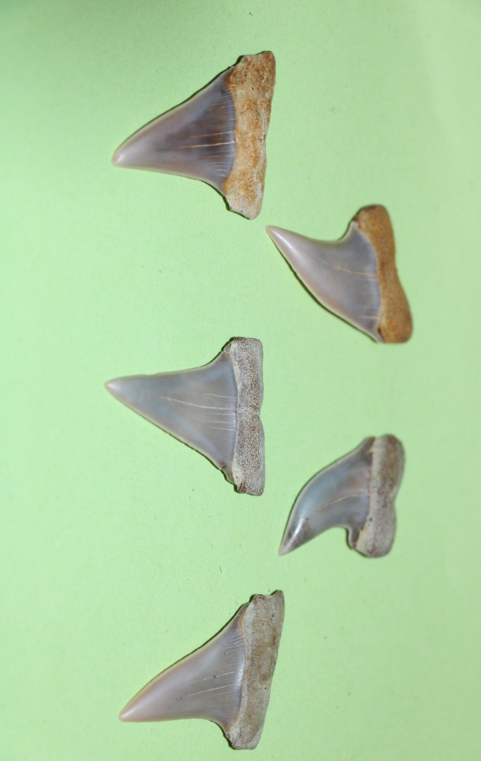 Carcharodon (Isurus) hastalis (4x) 3.8 x 2.6 cm, 3.7 x 2.5 cm, 3.6 x 2.3 cm, 3.2 x 2.1 cm, 3.8 x 2.5 cm