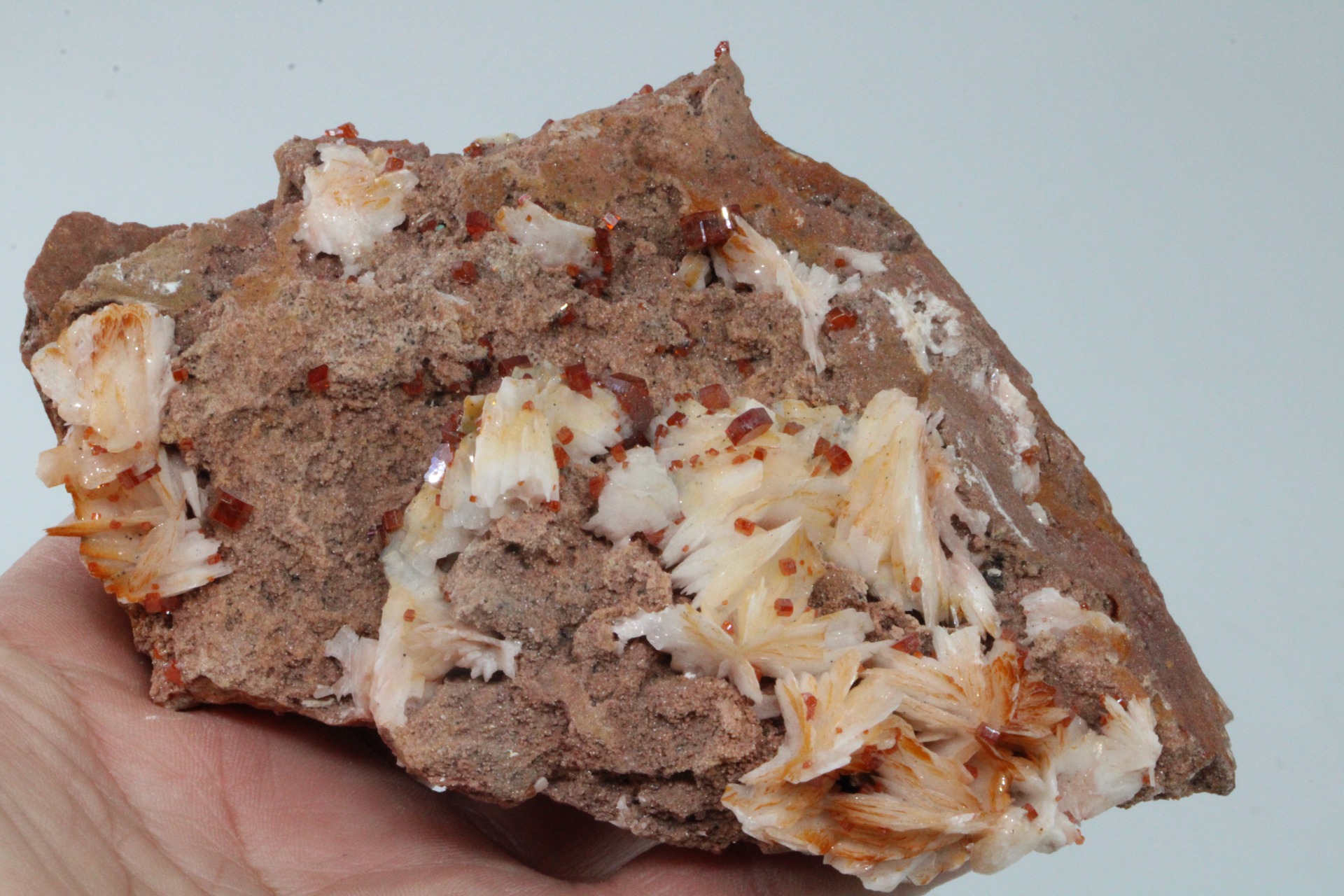 Met een veelheid aan perfect gedefinieerde, zeshoekige kristallen, in een zeer heldere oranjerode kleur, op bariet stuk van topkwaliteit..