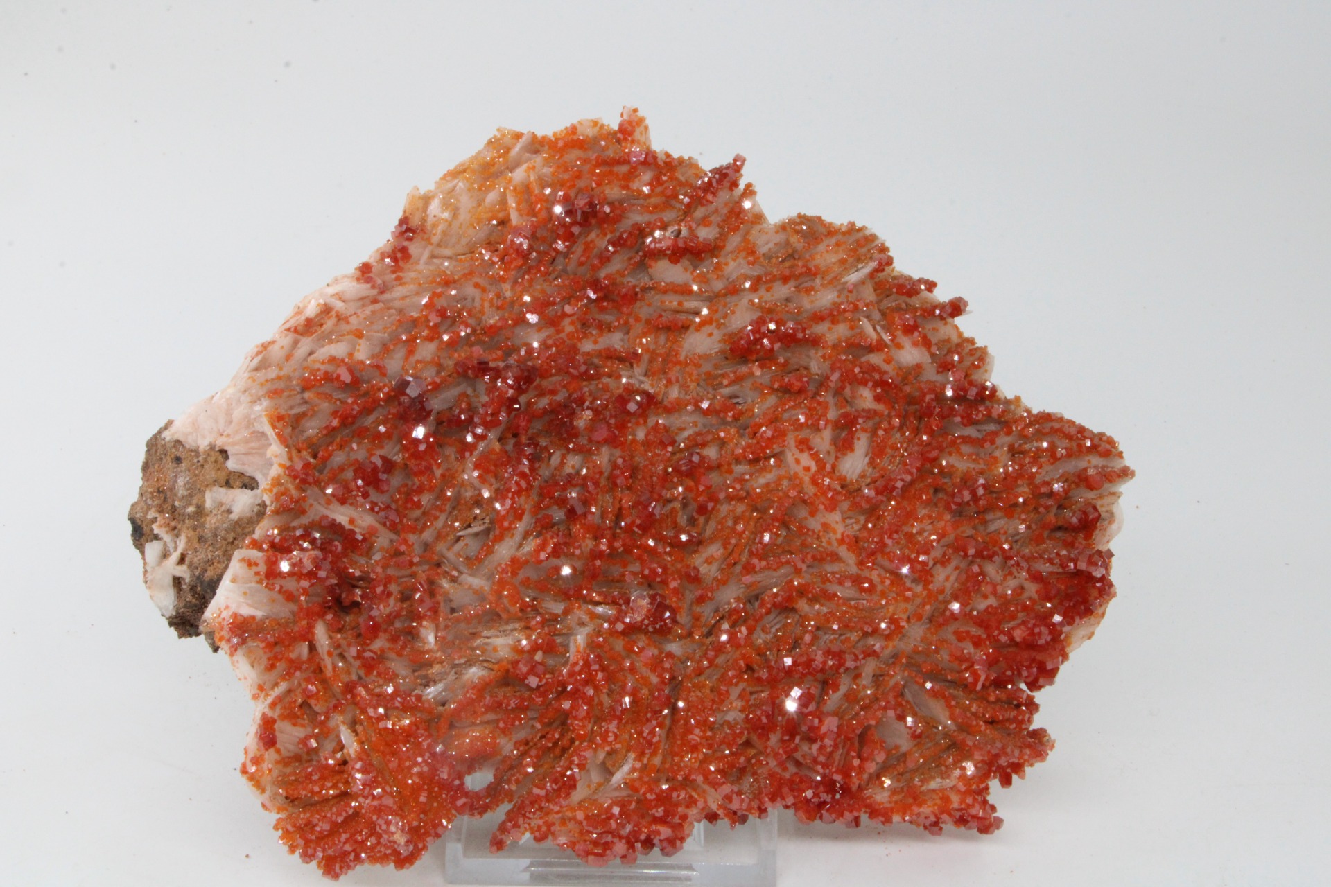 Met een veelheid aan zeer fijne perfect gedefinieerde, zeshoekige kristallen, in een zeer heldere oranjerode kleur,op bariet .stuk van topkwaliteit..