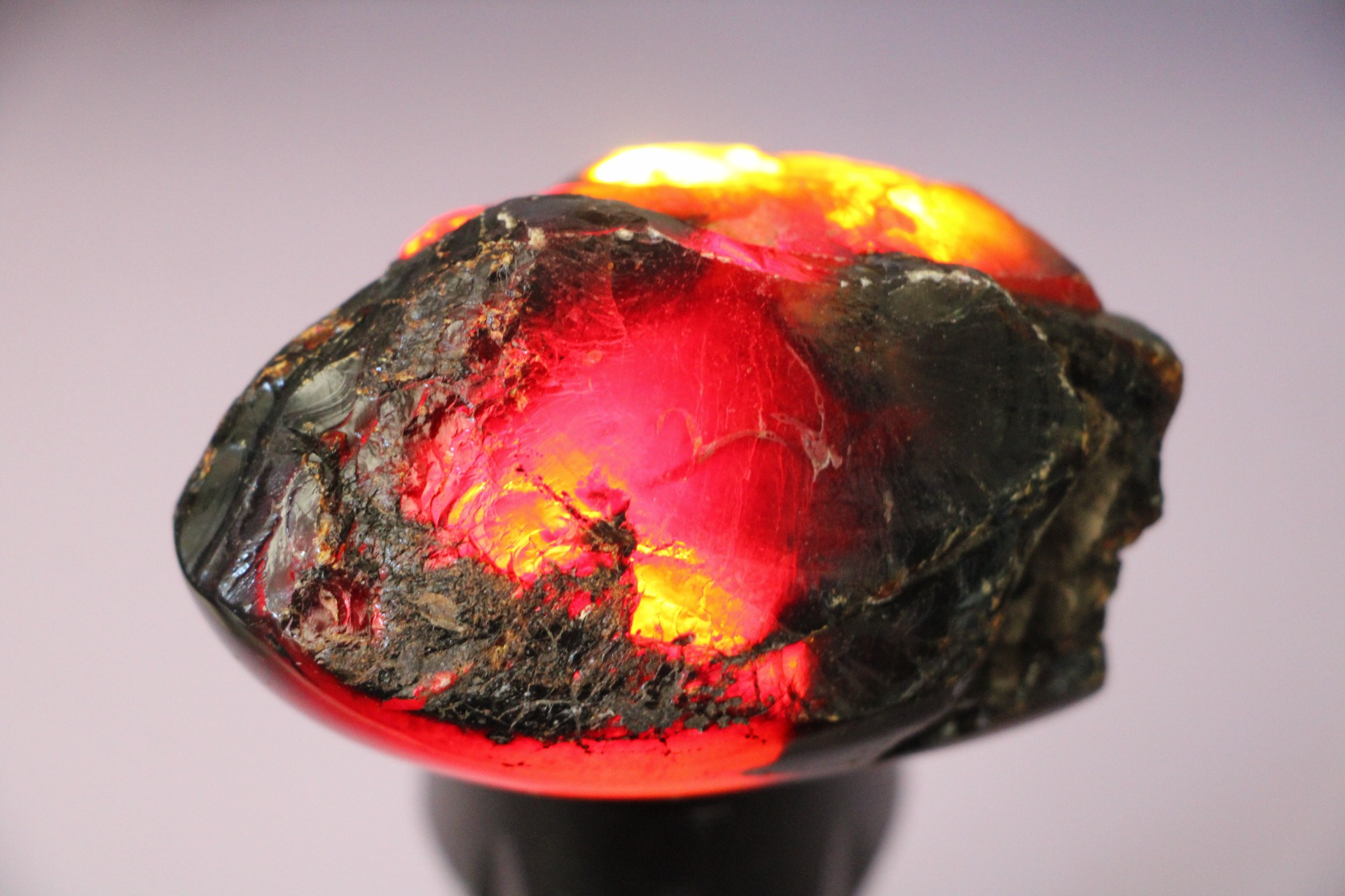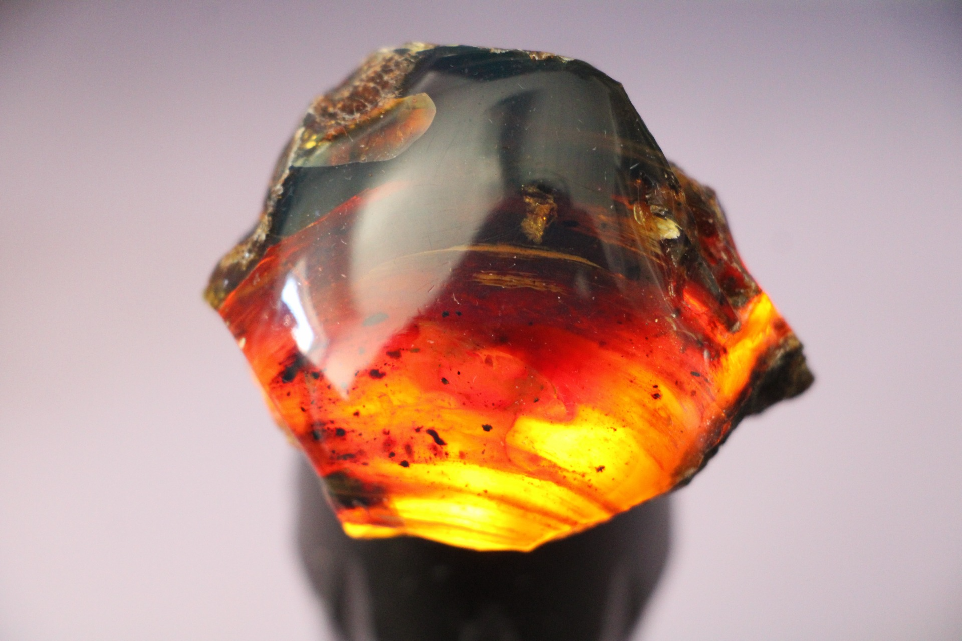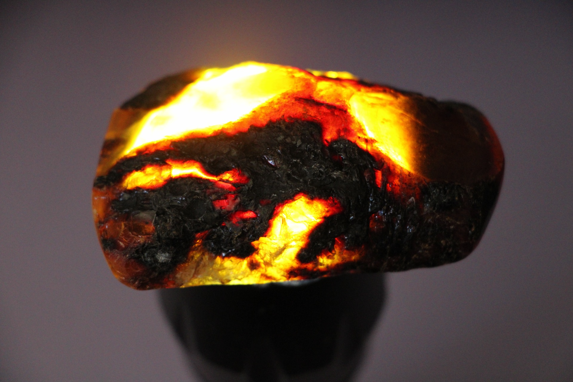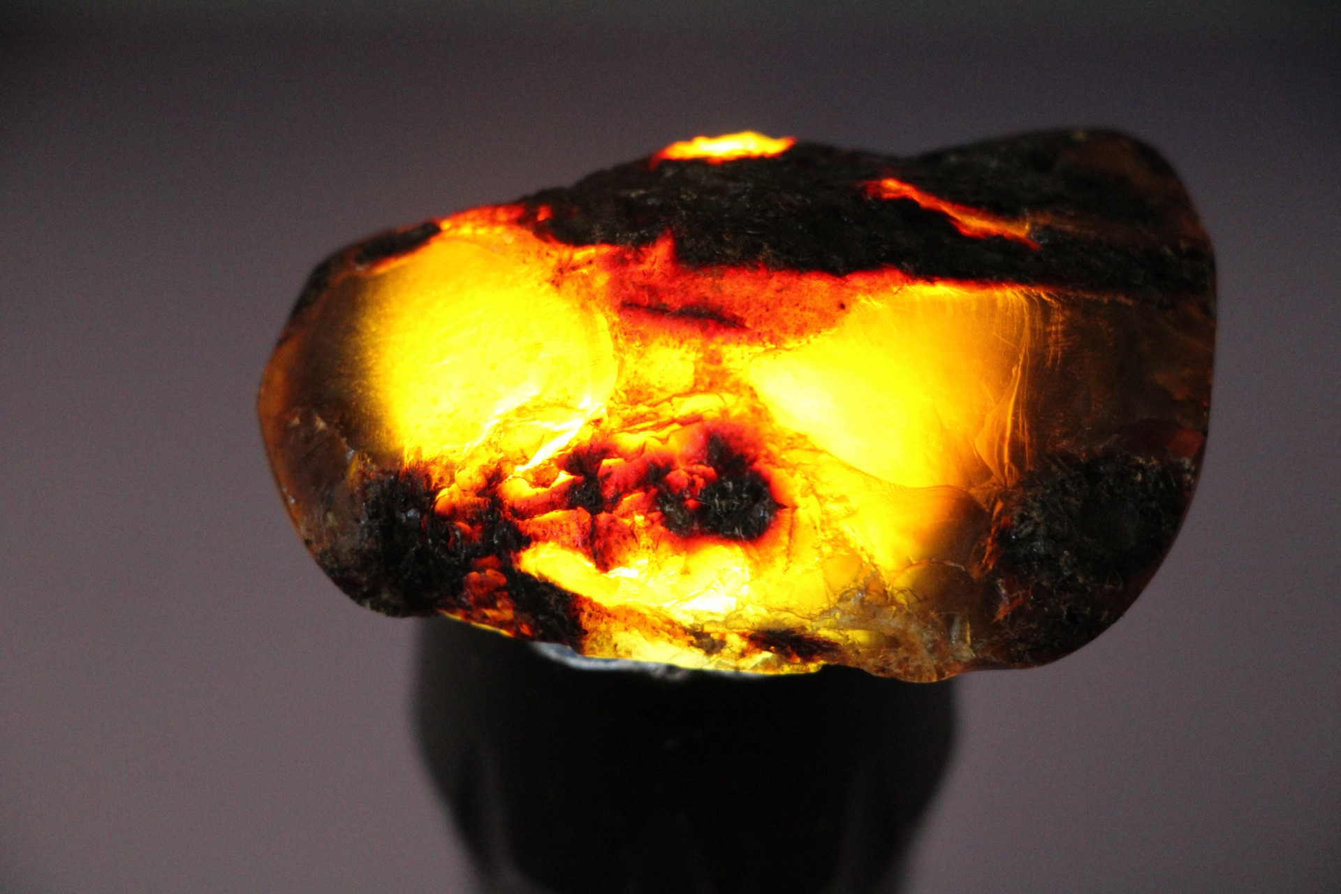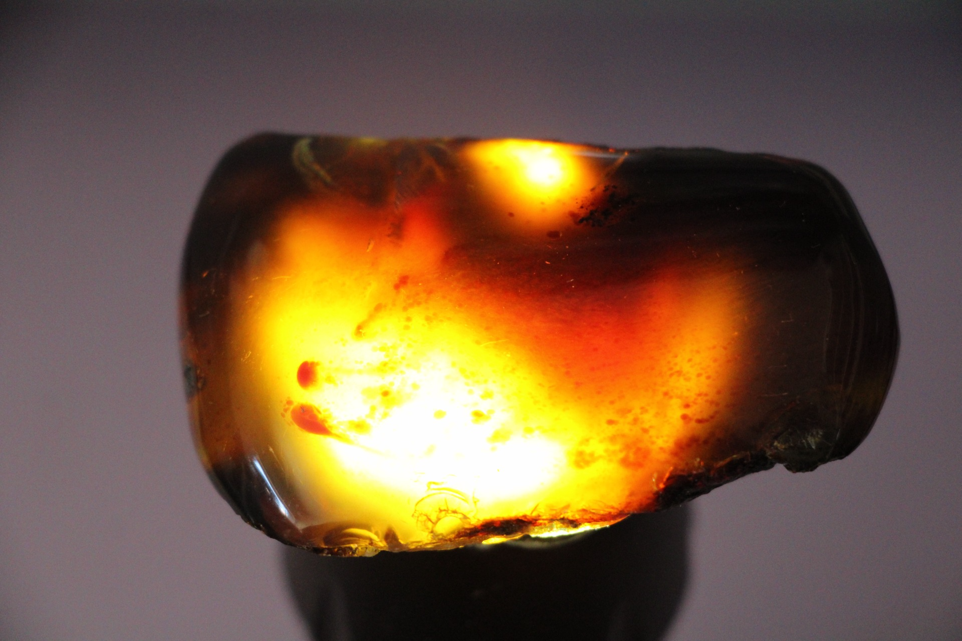 Wanneer het onder zonlicht of zelfs maar een reflecterende lichtbron wordt geplaatst, reflecteren delen van dit barnsteen de bruin/gele/rode kleur.