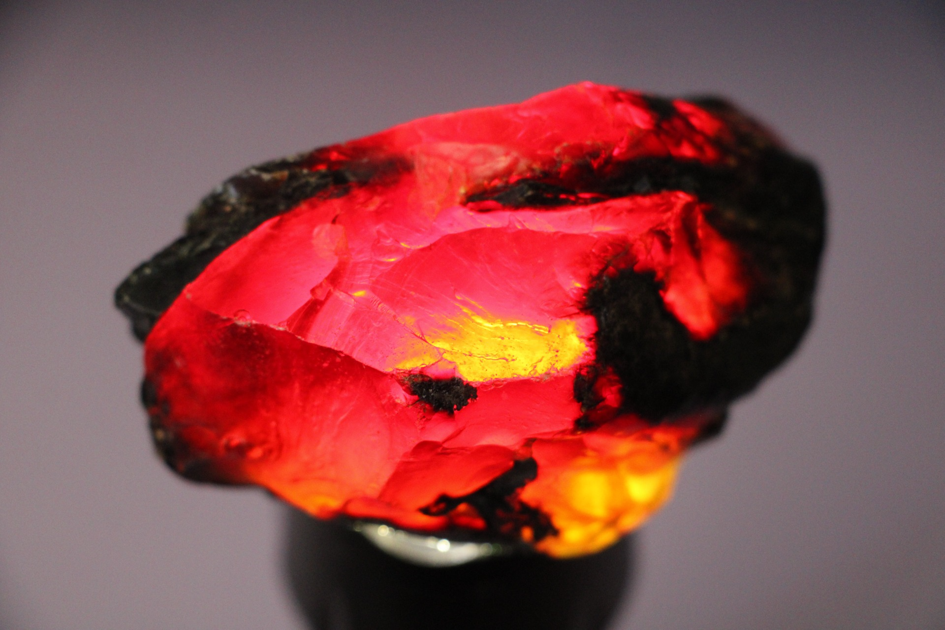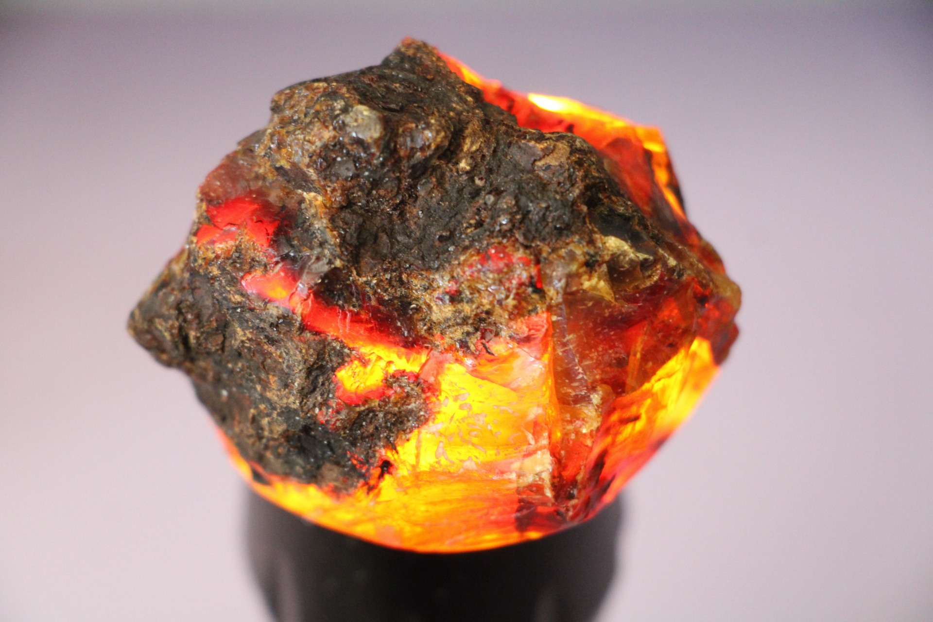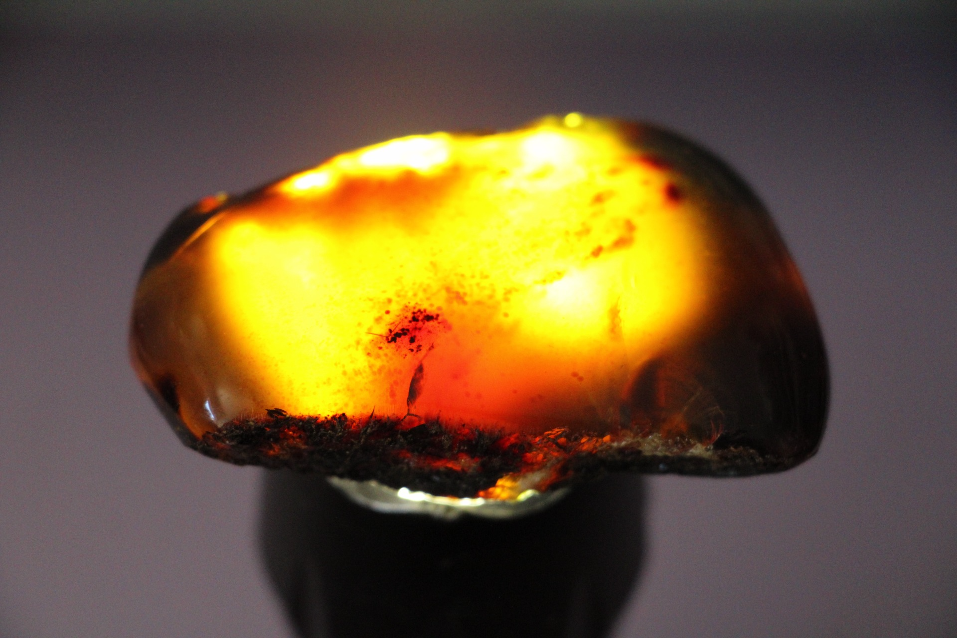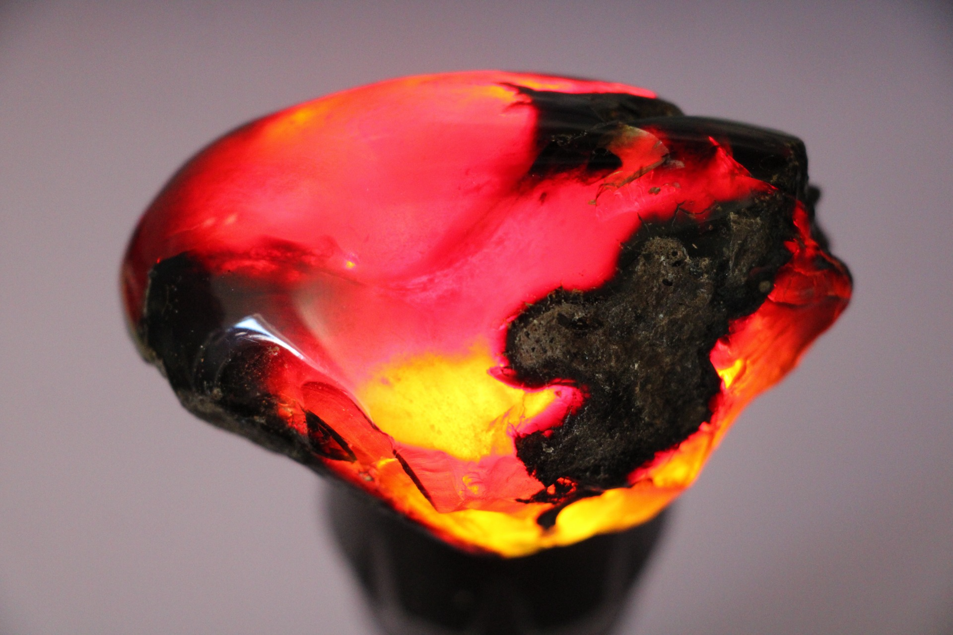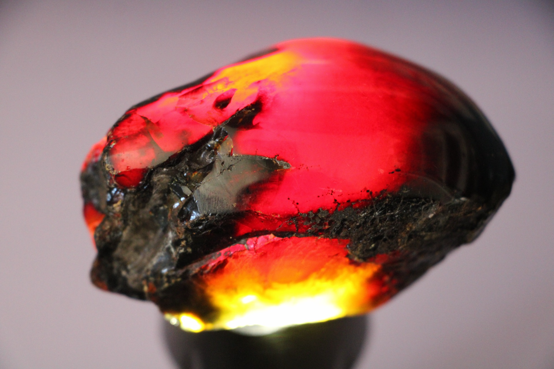 Wanneer het onder zonlicht of zelfs maar een reflecterende lichtbron wordt geplaatst, reflecteren delen van dit barnsteen de bruin/gele/rode kleur.