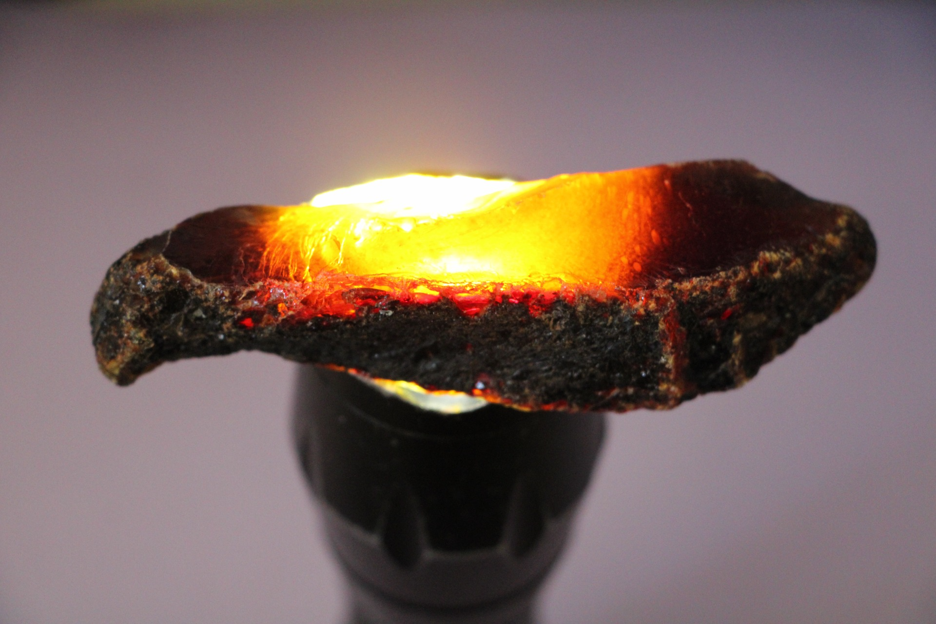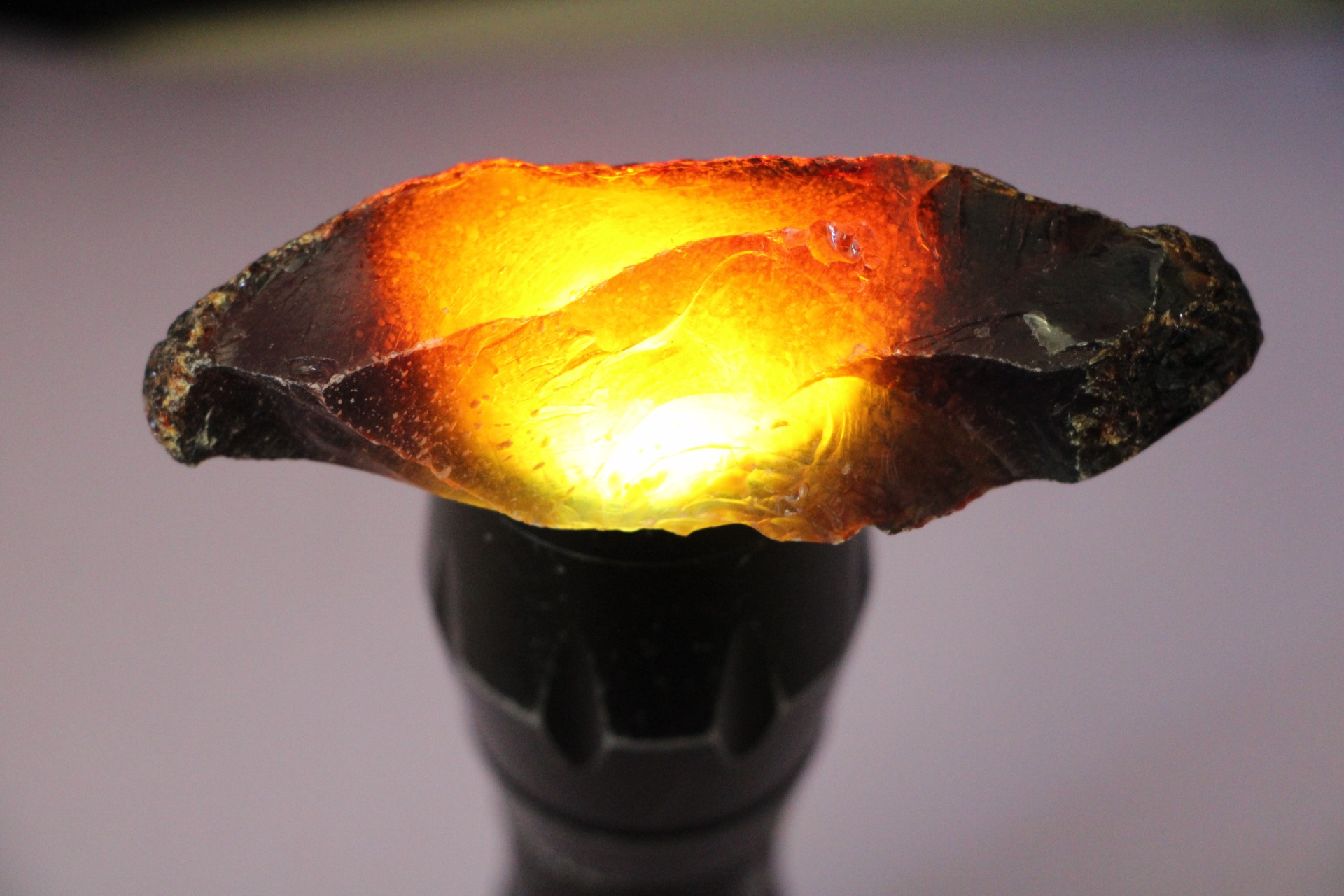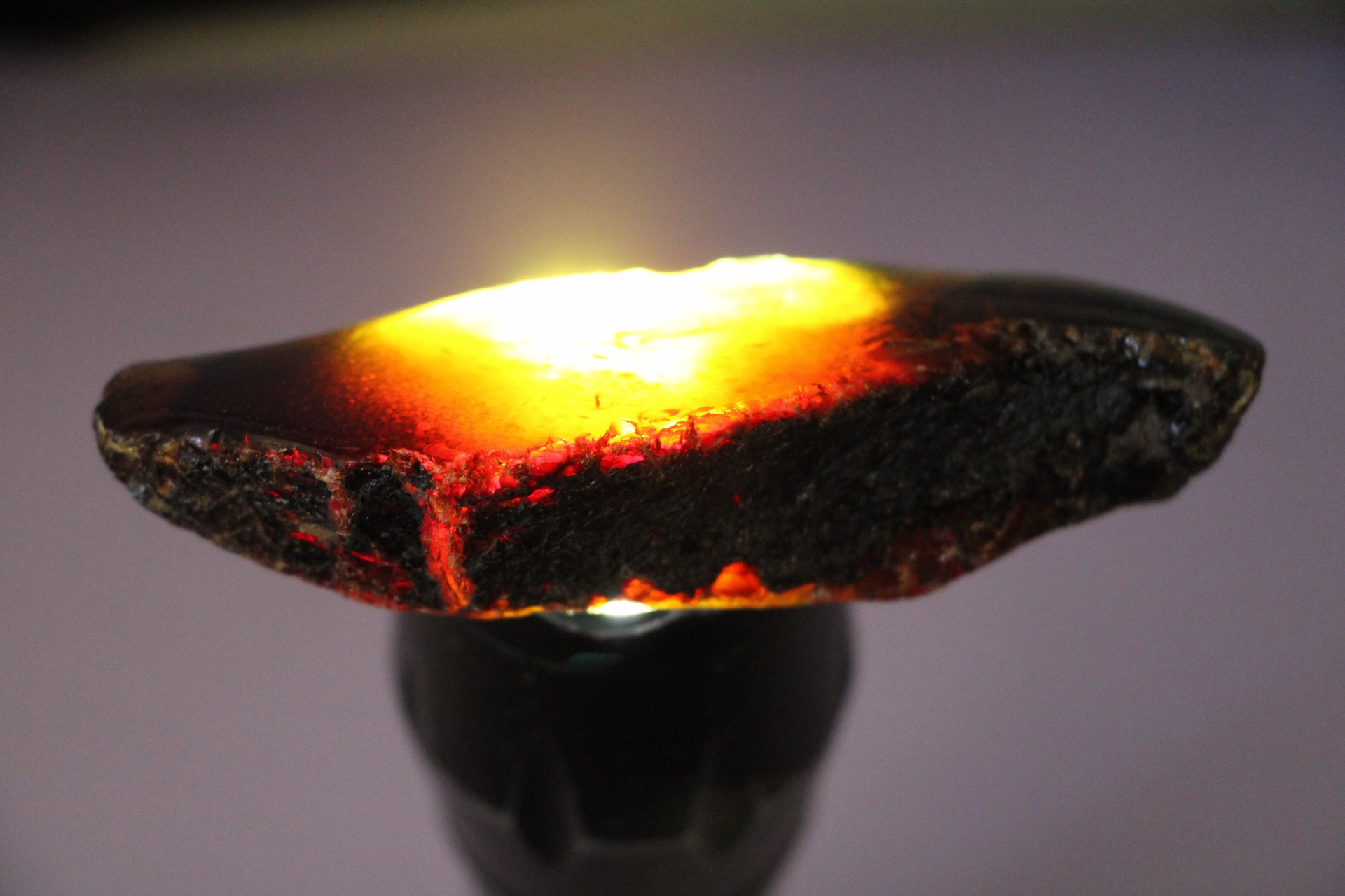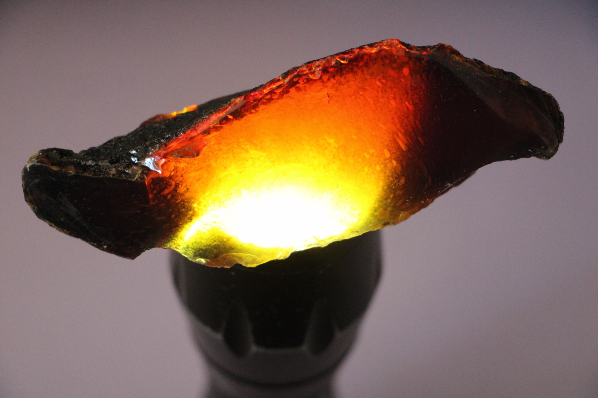 Wanneer het onder zonlicht of zelfs maar een reflecterende lichtbron wordt geplaatst, reflecteren delen van dit barnsteen de bruin/gele/rode kleur.