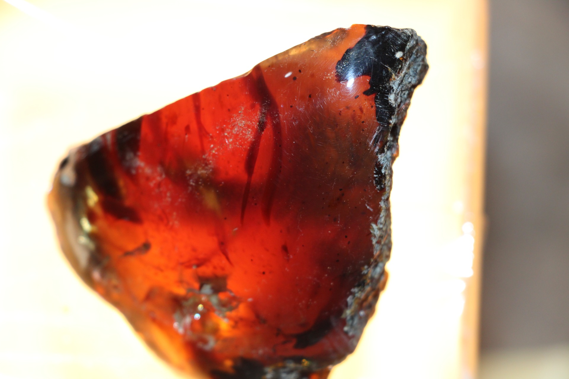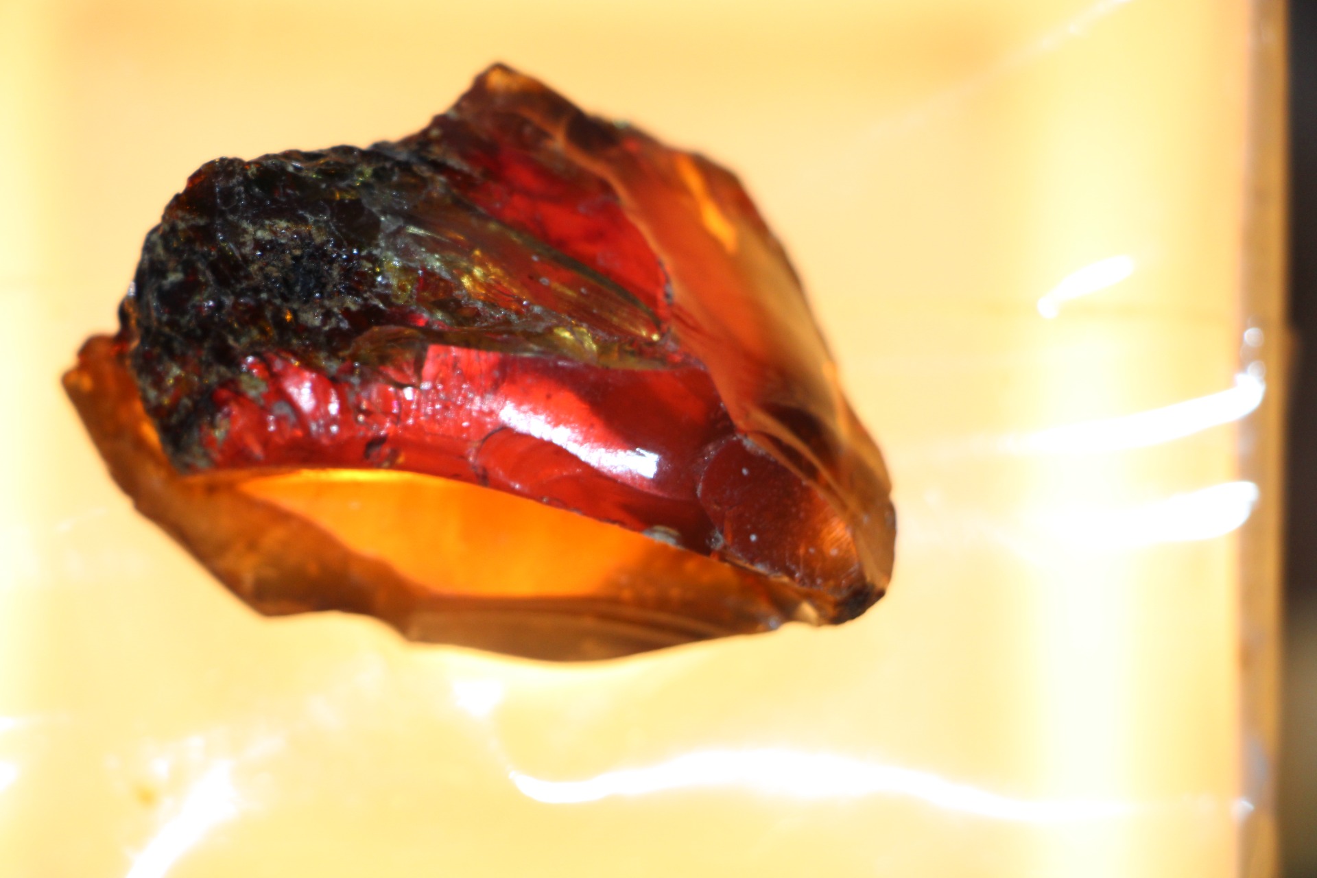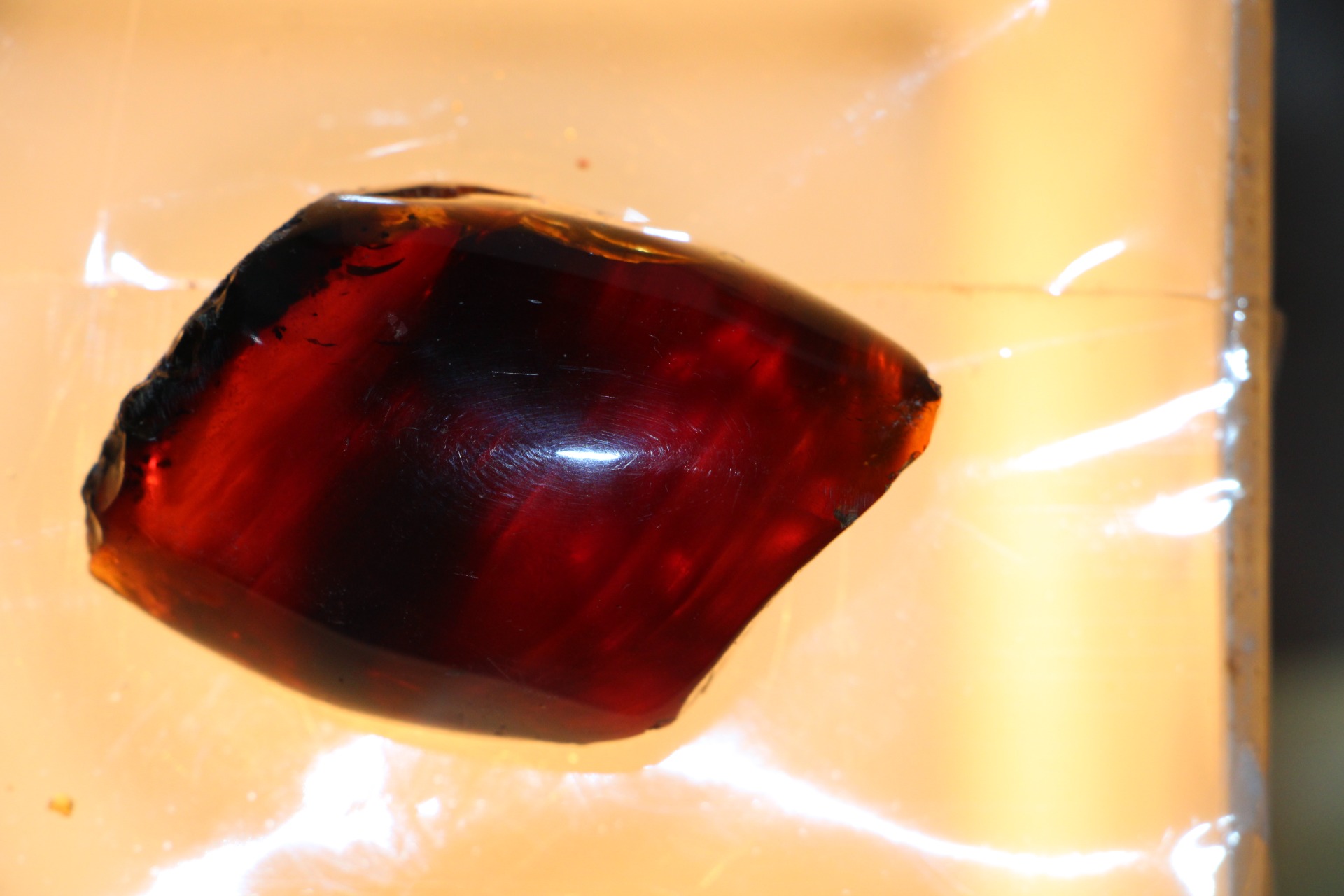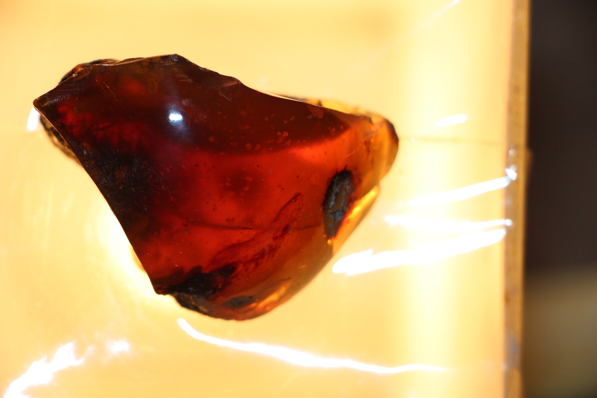 Wanneer het onder zonlicht of zelfs maar een reflecterende lichtbron wordt geplaatst, reflecteren delen van dit barnsteen de bruin/gele/rode kleur.
