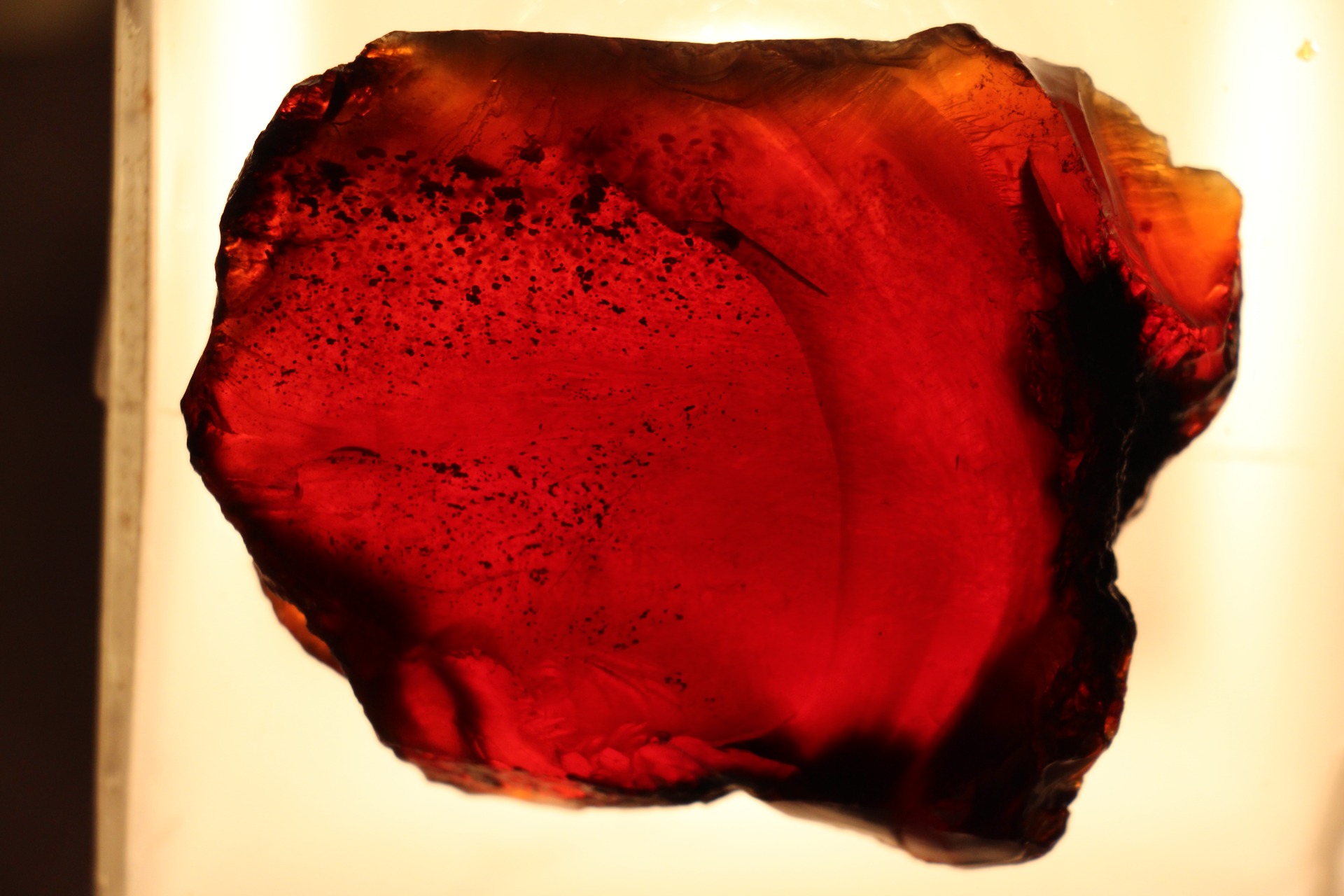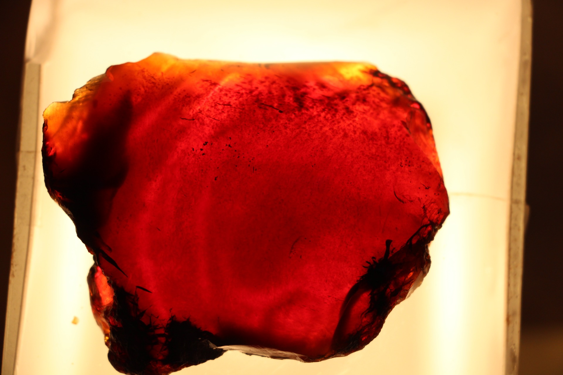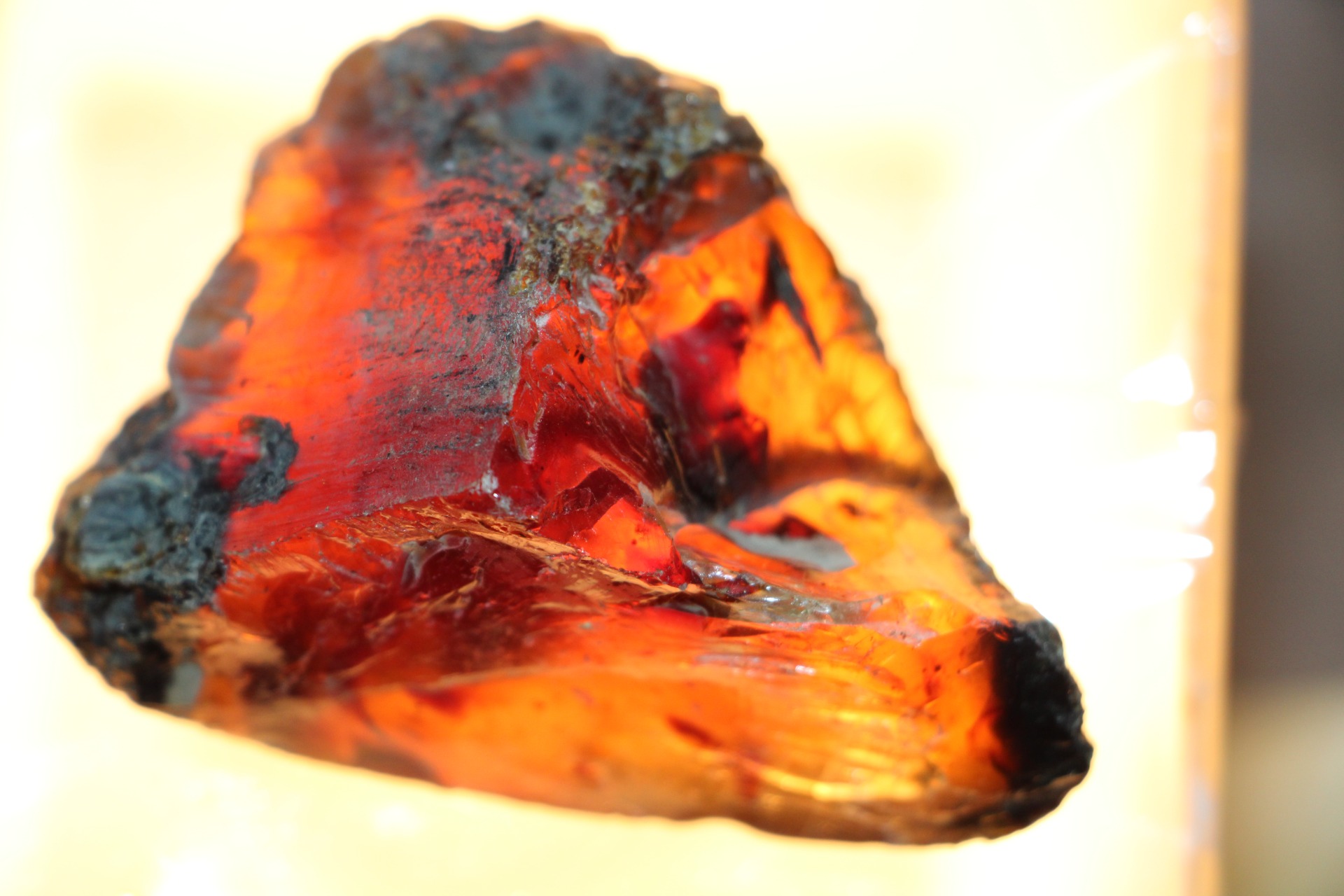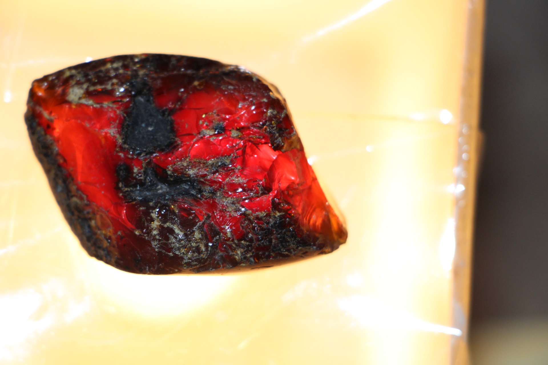 Wanneer het onder zonlicht of zelfs maar een reflecterende lichtbron wordt geplaatst, reflecteren delen van dit barnsteen de bruin/gele/rode kleur.