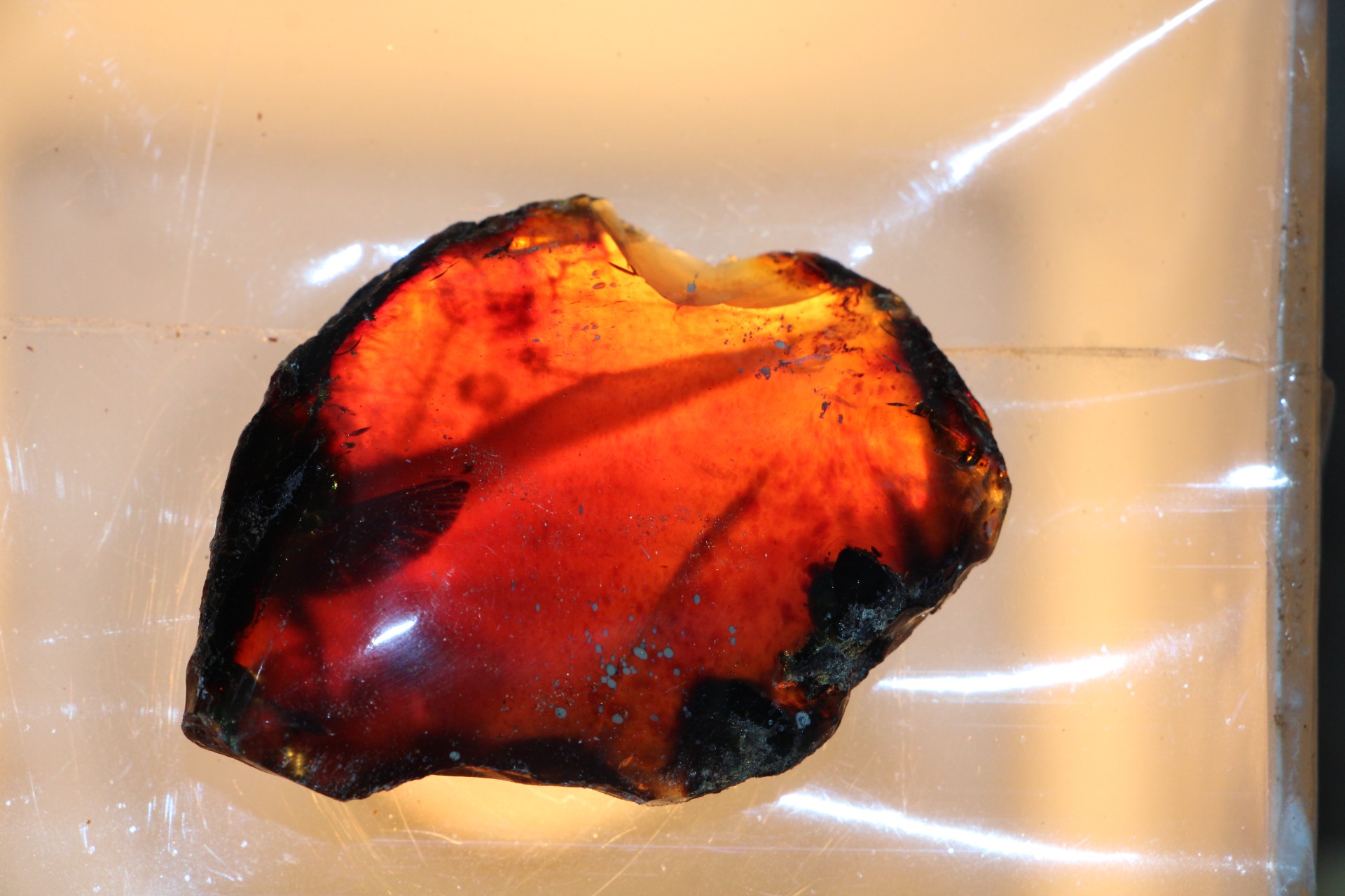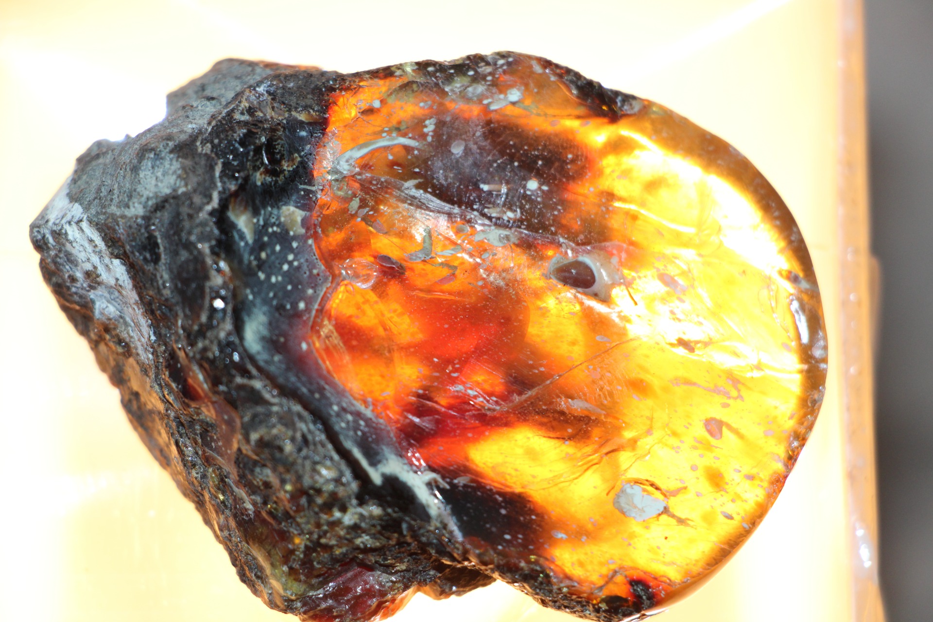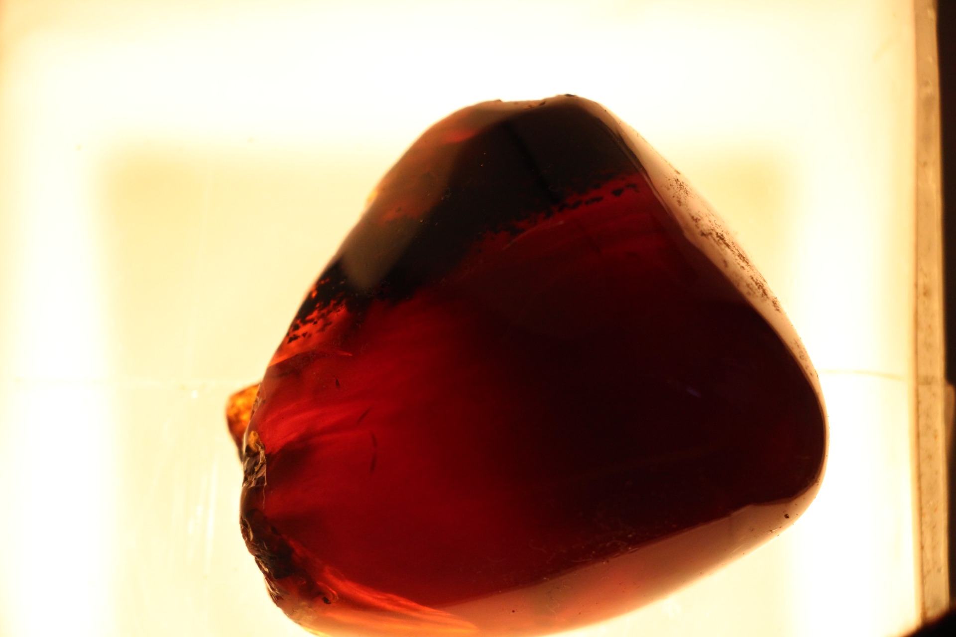 Wanneer het onder zonlicht of zelfs maar een reflecterende lichtbron wordt geplaatst, reflecteren delen van dit barnsteen de bruin/gele/rode kleur.