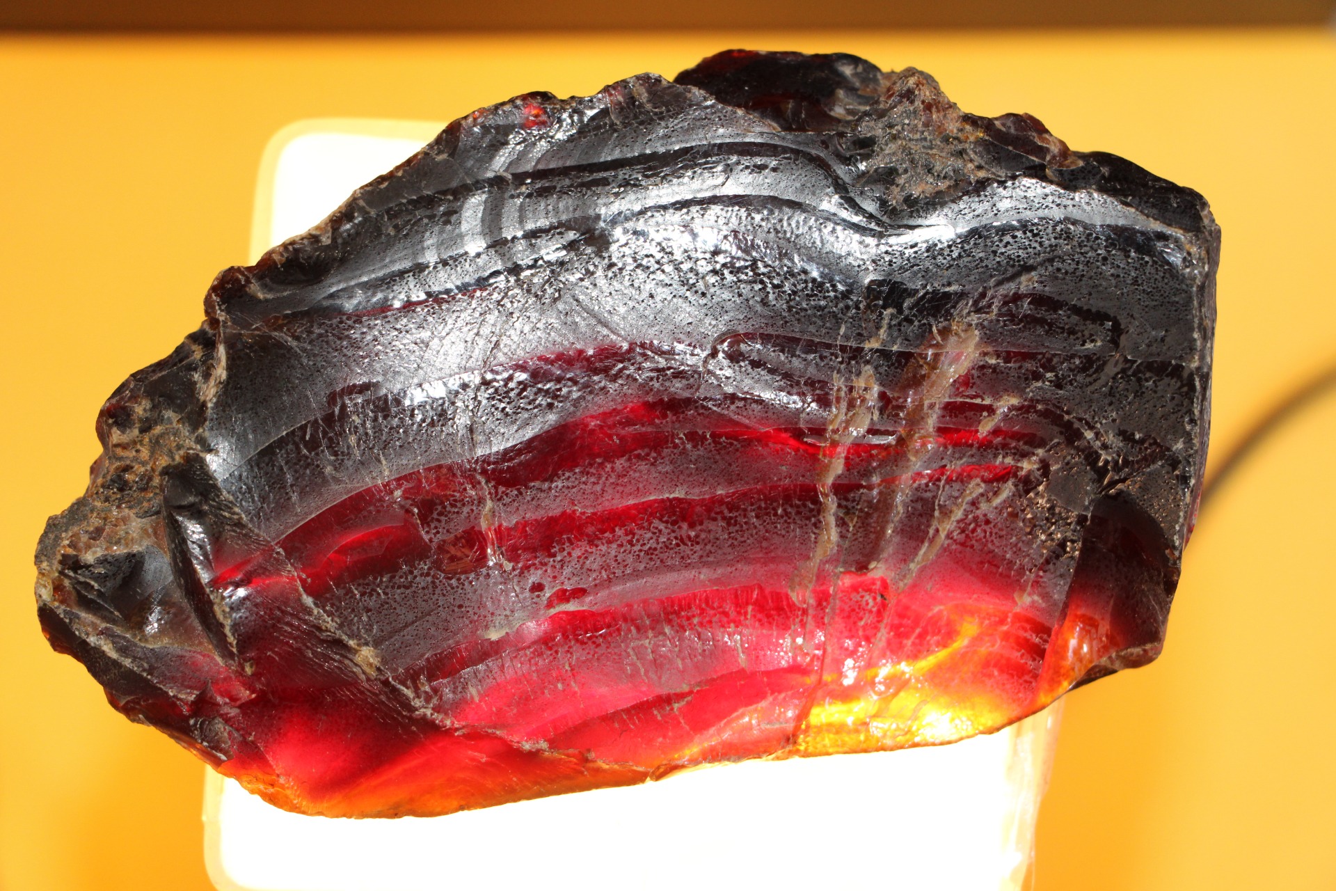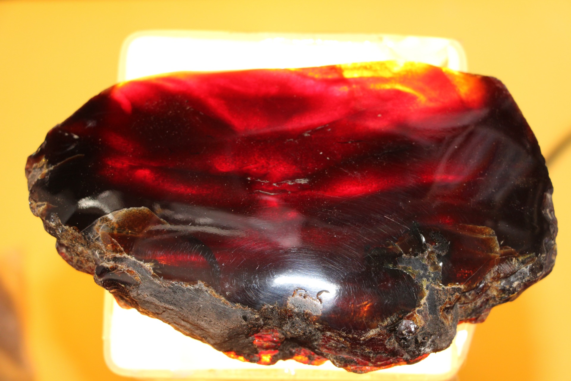 Wanneer het onder zonlicht of zelfs maar een reflecterende lichtbron wordt geplaatst, reflecteren delen van dit barnsteen de bruin/gele/rode kleur.