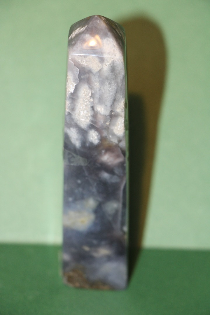 Paarse agaat is een variëteit van chalcedoon die bekend staat om zijn levendige paarse kleur en gebandeerde patronen, die kunnen variëren van lichtlavendel tot diep violet. Wanneer de steen in een obelisk wordt bewerkt, krijgt hij een hoge, vierkante taps toelopende vorm met een piramidale top. Deze vorm wordt traditioneel geassocieerd met het richten van energie, het verbeteren van meditatie en het versterken van spirituele intenties.